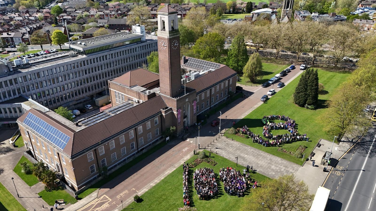 Public services and voluntary groups across Salford joined together in a unique way to wish the city a happy centenary birthday. More than 300 workers from local organisations formed two giant, human ‘100’ numbers on the civic lawns in front of Salford Civic Centre in an eye-catching moment to mark the milestone. Today, 21 April 2026, is one hundred years to the day since Salford was granted city status by King George V. Celebrations have been taking place in communities across Salford.